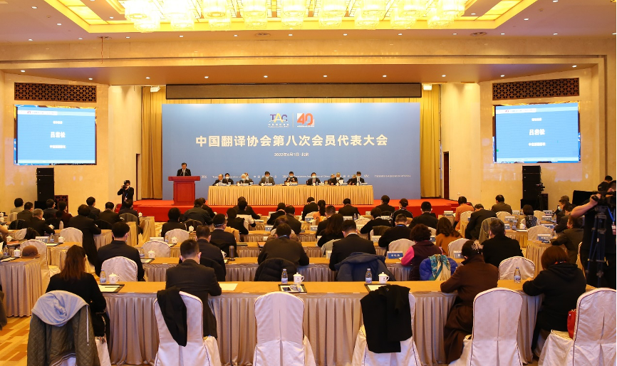 2022 年 4 月 1 日,中國(guó)翻譯協(xié)會(huì)第八次會(huì)員代表大會(huì)在北京天泰賓館隆重召開,來(lái)自中央國(guó)家機(jī)關(guān)、企事業(yè)單位、高等院校、科研機(jī)構(gòu)以及各翻譯界會(huì)員代表近 450 人出席了本屆線上、線下相結(jié)合的會(huì)議。